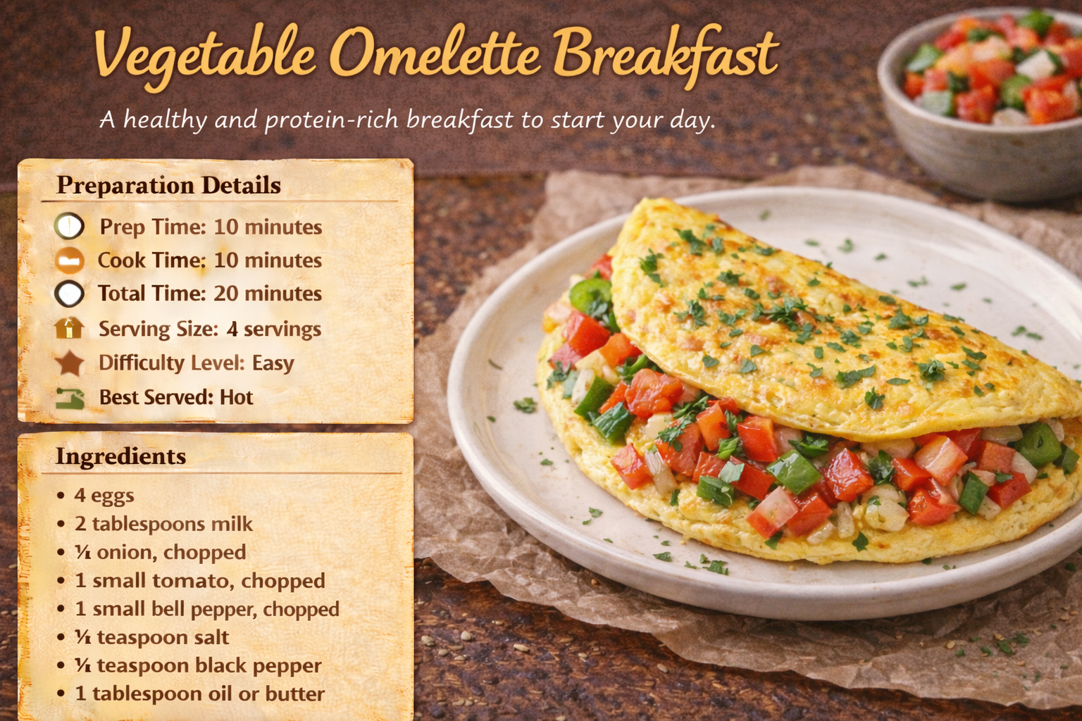 Breakfast Vegetable Omelette Breakfast A healthy and protein-rich breakfast to start your day. Preparation Details Prep Time: 10 minutesCook