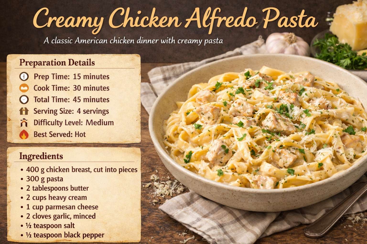 Chicken Dinners Creamy Chicken Alfredo Pasta A classic American chicken dinner with creamy pasta. Preparation Details Prep Time: 15 minutesCook Time: