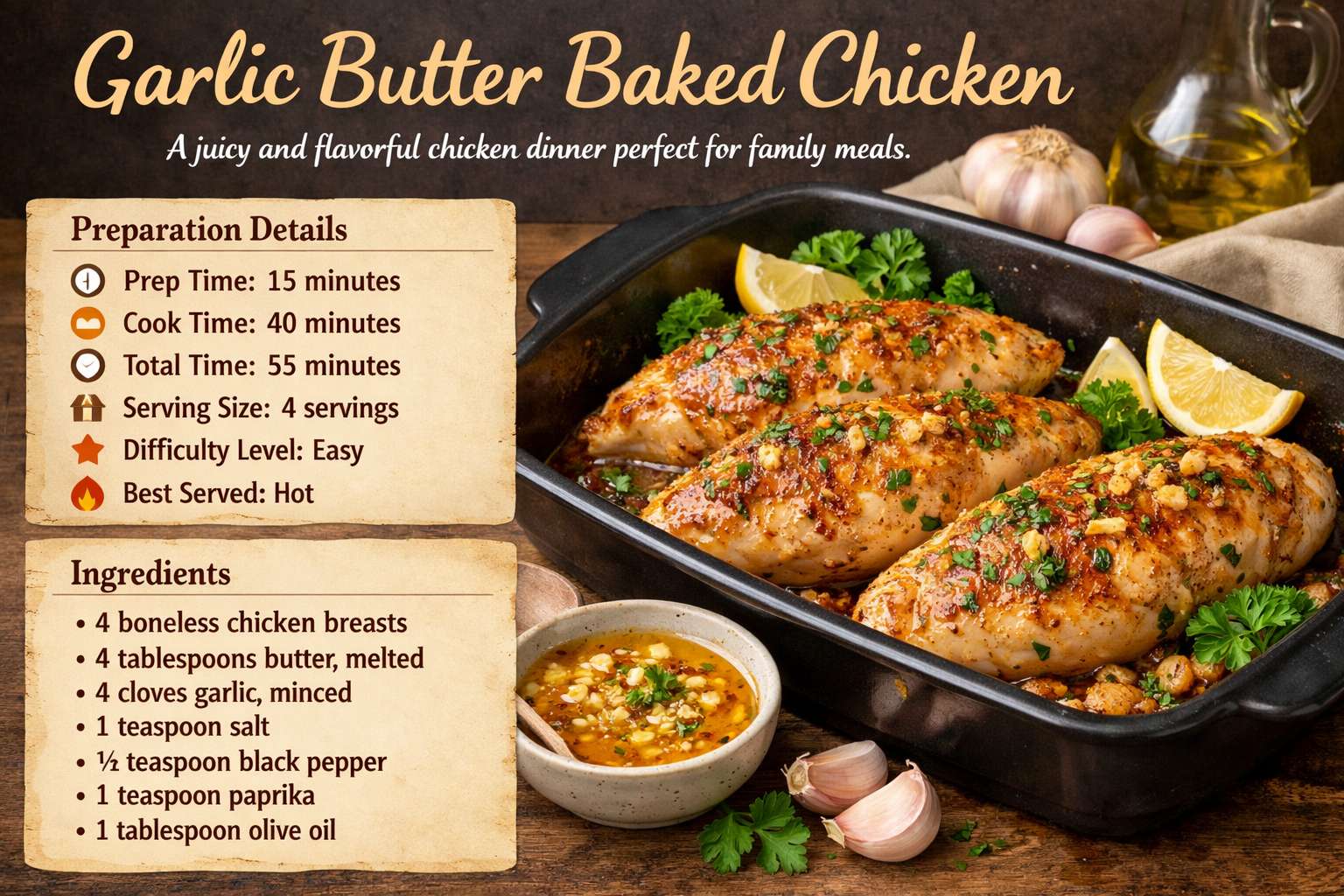 Chicken Dinners Garlic Butter Baked Chicken A juicy and flavorful chicken dinner perfect for family meals. Preparation Details Prep Time: 15