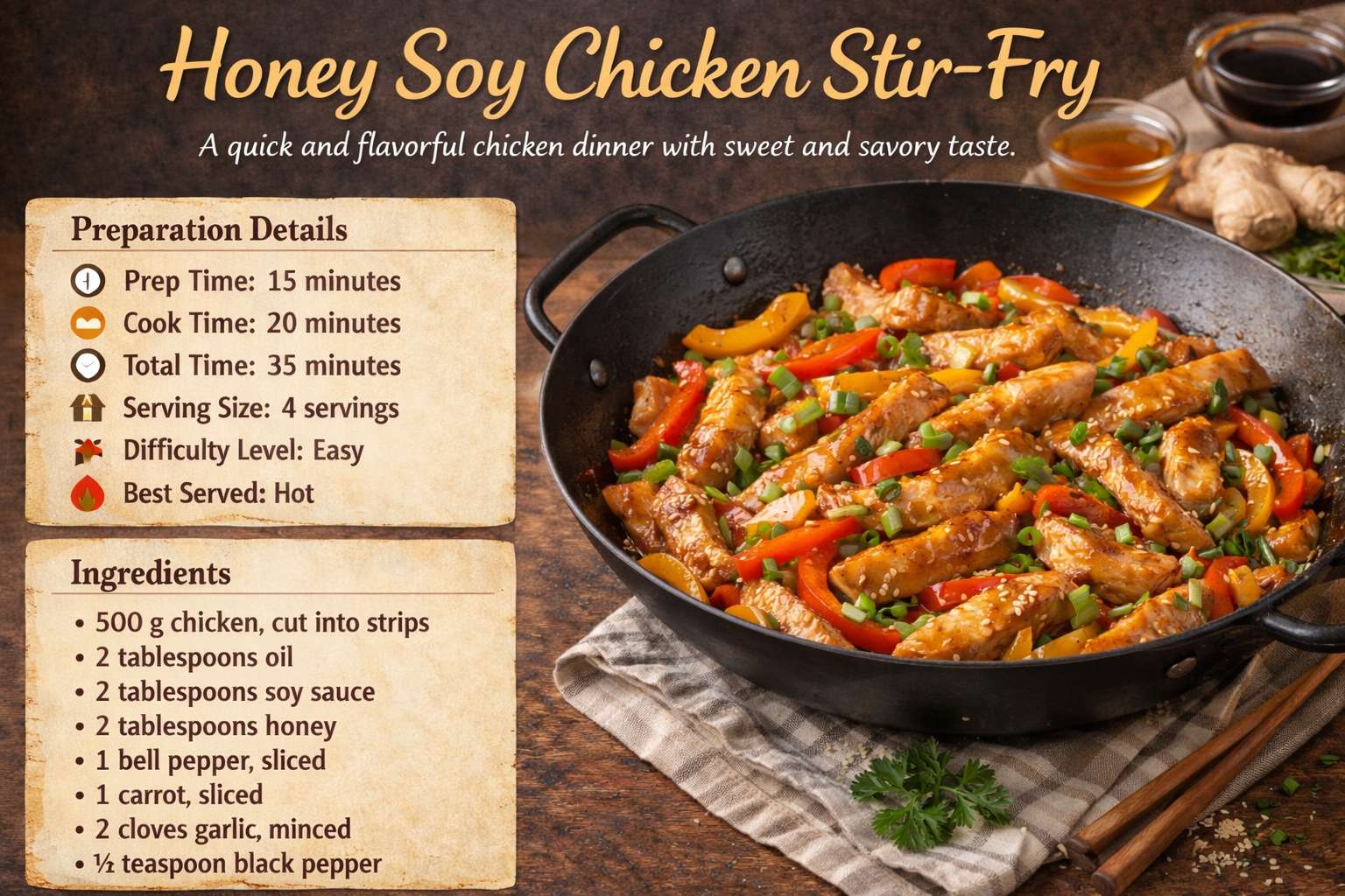 Chicken Dinners Honey Soy Chicken Stir-Fry A quick and flavorful chicken dinner with sweet and savory taste. Preparation Details Prep Time: