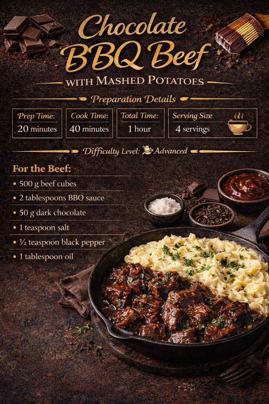 Experimental Meals Chocolate BBQ Beef with Mashed Potatoes A unique experimental sweet and savory main course used in modern restaurants. Preparation Details Prep