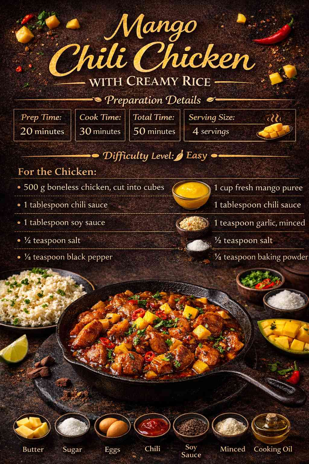 Experimental Meals Mango Chili Chicken with Creamy Rice A fusion of sweet, spicy, and creamy flavors, popular in experimental modern kitchens. Preparation Details