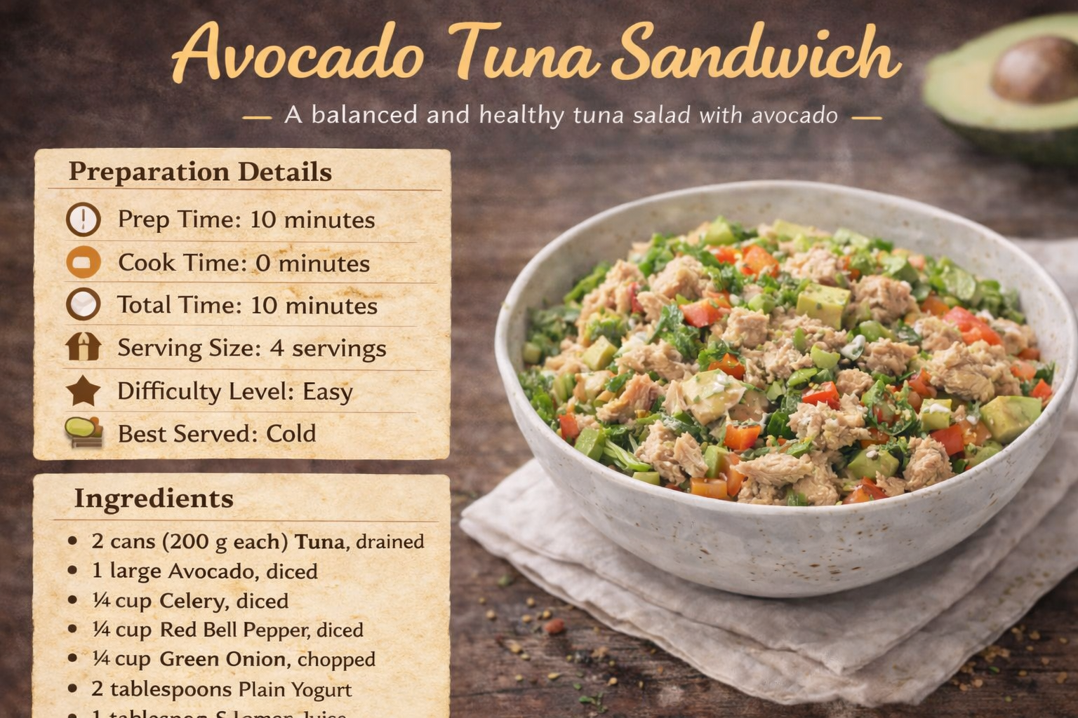 Healthy Lunches Avocado Tuna Sandwich A quick and heart-healthy lunch rich in protein and healthy fats. Preparation Details Prep Time: