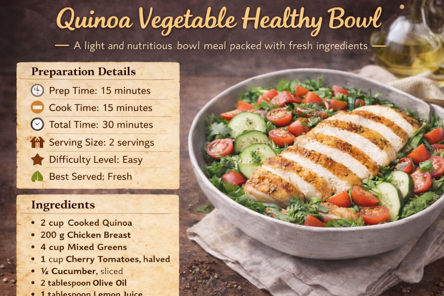 Healthy Lunches Quinoa Vegetable Healthy Bowl A balanced healthy lunch rich in protein, fiber, and nutrients. Preparation Details Prep Time: 10