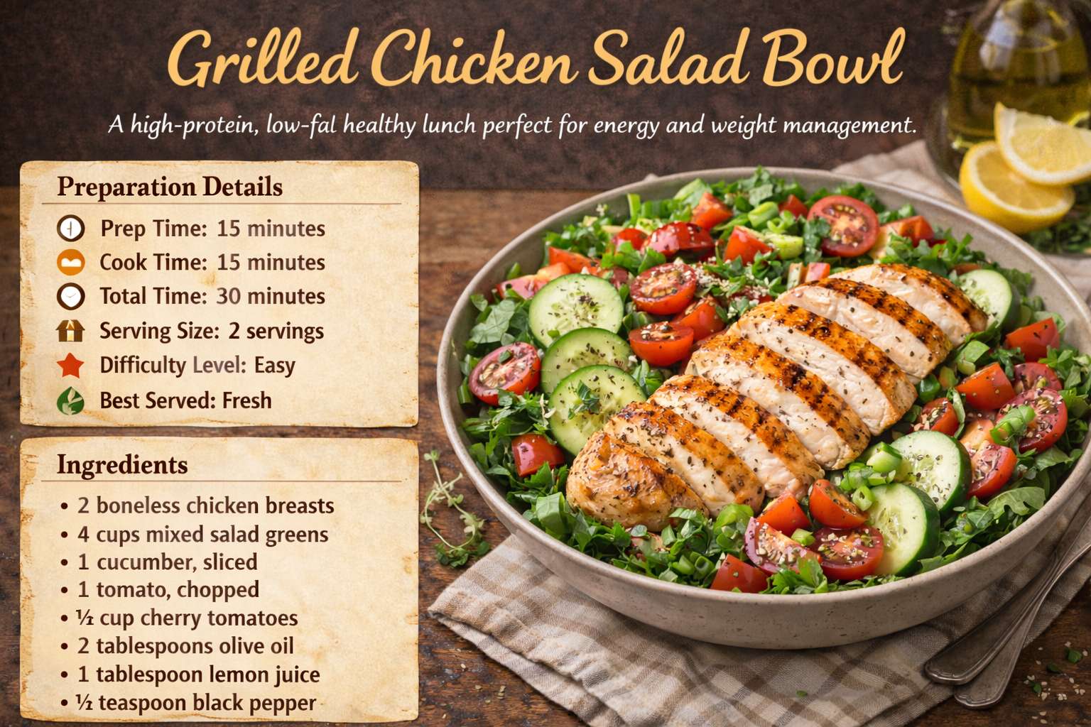 Healthy Lunches Grilled Chicken Salad Bowl A high-protein, low-fat healthy lunch perfect for energy and weight management. Preparation Details Prep Time: