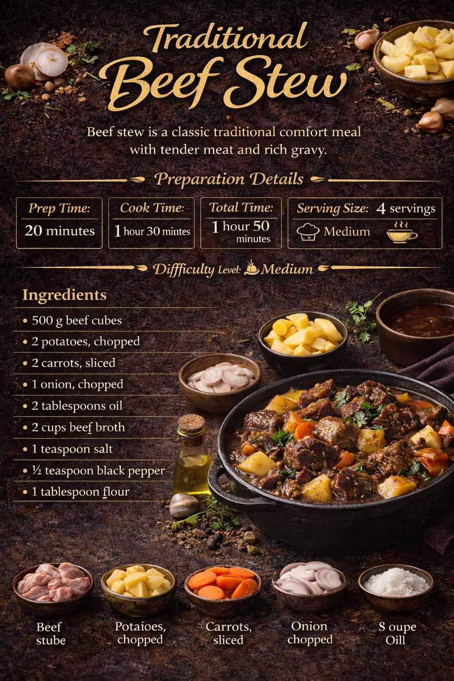 Traditional Meals Traditional Beef Stew Recipe Beef stew is a classic traditional comfort meal with tender meat and rich gravy. Preparation