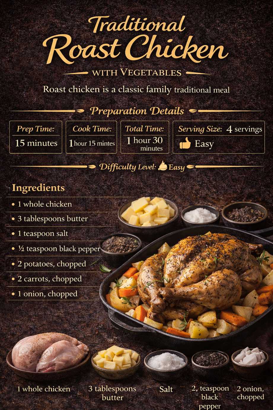 Traditional Meals Traditional Roast Chicken with Vegetables Roast chicken is a classic family traditional meal. Preparation Details Prep Time: 15 minutesCook Time: